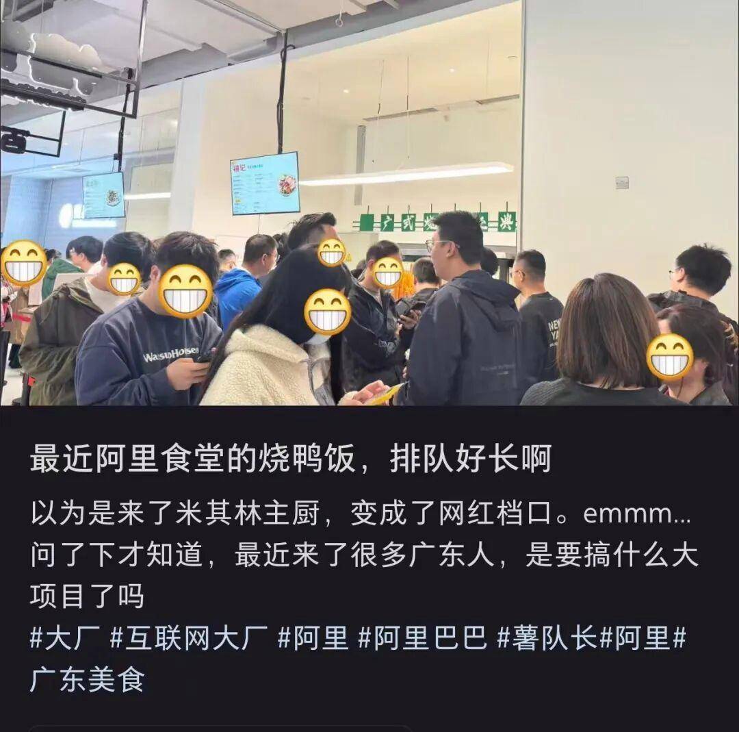 招来的各路人马中,疑似广东人最多。爆料称阿里食堂的粤菜窗口开始排起长龙,烧鸭饭都要卖脱销了。